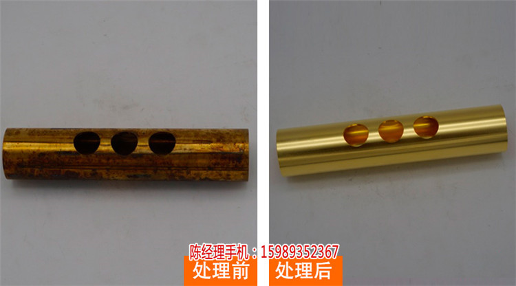 品质要求:铜是一种比较活跃的金属容易氧化,在使用一定时间后表面会产生一层氧化皮,影响产品的性能及美观。该客户生产的铜件已经氧化变色,有变暗,红点,指纹印,达不到出货要求的外观色泽一致,抗氧化效果在一年不氧化变色标准。前期有采用人工、机械抛光效率低而且工件公差不一致外观效果不理想等不良。后从同行那边了解到我司有专业的铜材除氧化及抗氧化的葯水及方案,于是找到了我们,之后我司工程师到东莞塘厦镇XX五金制品有限公司了解了具体品质要求及设备状况后结合现场情况制定了几套方案给这家客户试样,最终采用了如下方案。