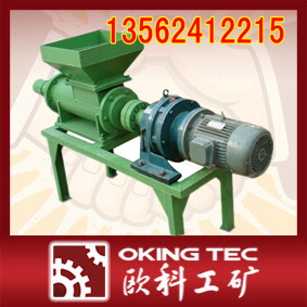 新型炮泥机的说明: 新型矿用炮泥机,是为钻孔工程使用的炮泥,而研制的专用生产设备,生产圆柱状长条形炮泥,供煤矿或冶金矿山等开采作业中,封闭已装填好的炮眼。该炮泥机可实现井下作业制成品炮泥,工作效率高,且结构简单,便于操作。同时,还可以根据需要,更换炮泥挤出口的直径,制作出现场生产所需的不同直径规格的炮泥,具有适应性强、效率高、炮泥成型好、对炮眼封堵效果好等优点。可应用于井上、下过程中成品炮泥的加工制作,广泛使用于采矿、铁道、公路、隧道、桥梁、建筑、交通、水利工程等行业。矿用炮泥机由电动机、齿轮箱、机体、破碎搅拌机构、成型脱模机构、机座和工作附件等部分组成。多年以来,工程所使用的炮泥,均由工人在施工现场拌和粘土,用手工捏制而成,工作效率低,劳动强度大,工作环境差,炮泥成型很不规范,严重影响了效果。欧科研发生产的炮泥机作为具有现场动力来源方便、便于迁移、输出成品速度可调、安全可靠等特点,解决了炮泥生产机械化和自动化问题。