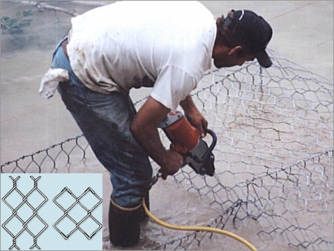 为了减轻湍急的水流冲刷河堤,在河堤的内侧或者河槽的边缘,铺铅丝笼或者铅丝笼垫,汹涌的河水直接冲击铅丝笼或者铅丝笼垫,这样保护河堤或者河槽。