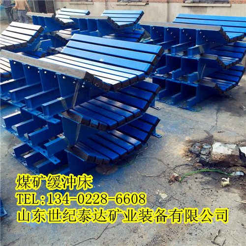 普通缓冲床用于物料装载及落料点的缓冲减震,通常缓冲床由缓冲条纵向排列组成,世纪泰达矿机缓冲条采用德国最先进热硫化生产工艺,进口天然橡胶与UHMV超高分子聚乙烯合二为一,具有很好的耐磨性和抗冲击性,是替代缓冲托辊的最佳设备,缓冲条和防溢裙边、清扫器配合使用,具有很好的密封效果,能最大程度上防止物料的溢出和洒落,充分改善落料区的除尘清洁情况,缓冲条优异的缓冲性能,耐冲击、耐磨损等特性,保证了输送系统持久和高效的运行。