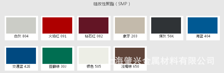 由于聚酯含有活性基-OH/-COOH,极易和其它高分子化合物反应,为改良PE的耐阳光性和粉化性,以色泽保持性与耐热性优的silicone树脂做变性反应,和PE的变性比可于5%-50%之间;SMP提供钢板更好的持久性,其防腐蚀年限可达10-12年;当然其价格也比较PE为高,但因silicone树脂对材质的附着性和加工成型性并不理想,因此SMP彩涂板并不适用于需要多次成型加工的场合,大部分用于建筑屋顶及外墙。"