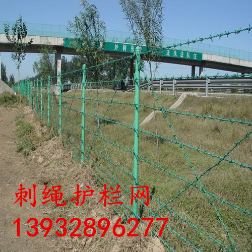 用途:用于草场边界、铁路、高速公路的隔离防护等。 针对一些客商定制的特殊规格、型号的刺网,无论是量大还是量小,本厂都能迅速组织生产,生产经营多种规格、型号的冷镀锌刺绳、热镀锌刺绳、涂塑PVC、PE刺绳、刺网等系列产品广泛用于高速公路、铁路、国防、围栏(草原、果园)等行业。