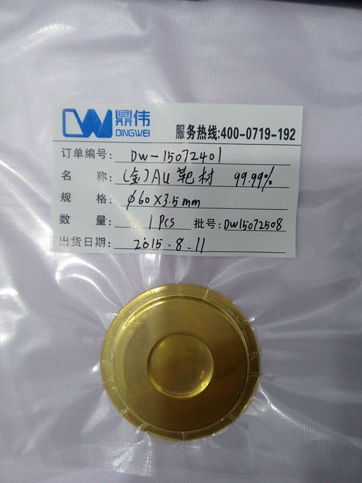 规格:金靶(平面圆靶,方靶,旋转靶,台阶靶均可加工,规格按客户要求定做) 金粒(规格Φ2*5mm,Φ2*10mm,其他规格定做)