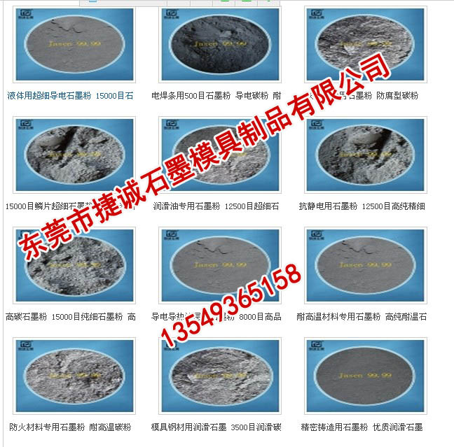 东莞市捷诚石墨制品有限公司主要生产销售各种石墨粉和其他石墨制品,有石墨电极粉,高纯石墨粉,导电石墨粉,防静电石墨粉,润滑碳粉等各种规格石墨粉,粗细标准不一样,目数从150目-15000目,规格齐全,可用于涂料导电,塑料改性,橡胶导电和填充,高温润滑剂,润滑油,导电油墨,做各种导热散热材料,欢迎各界朋友莅临我厂考察合作