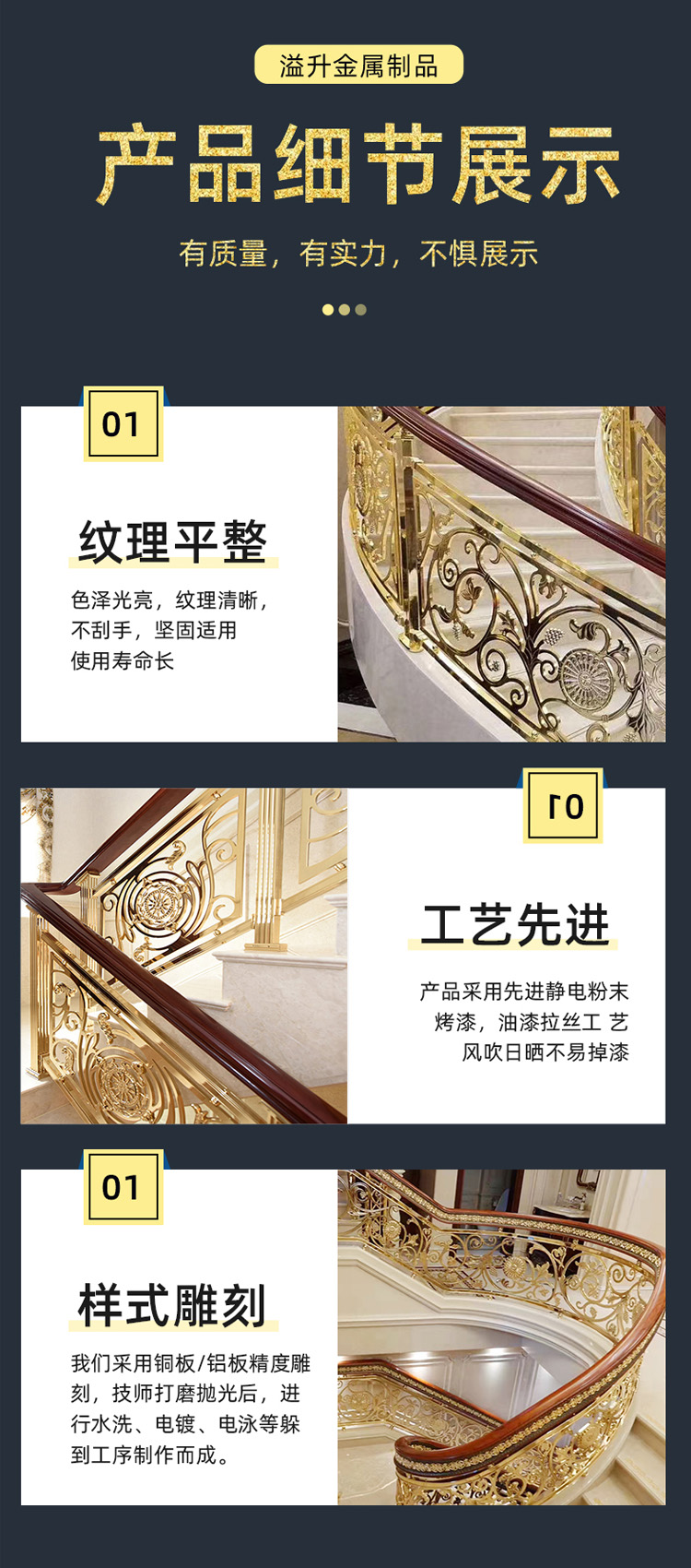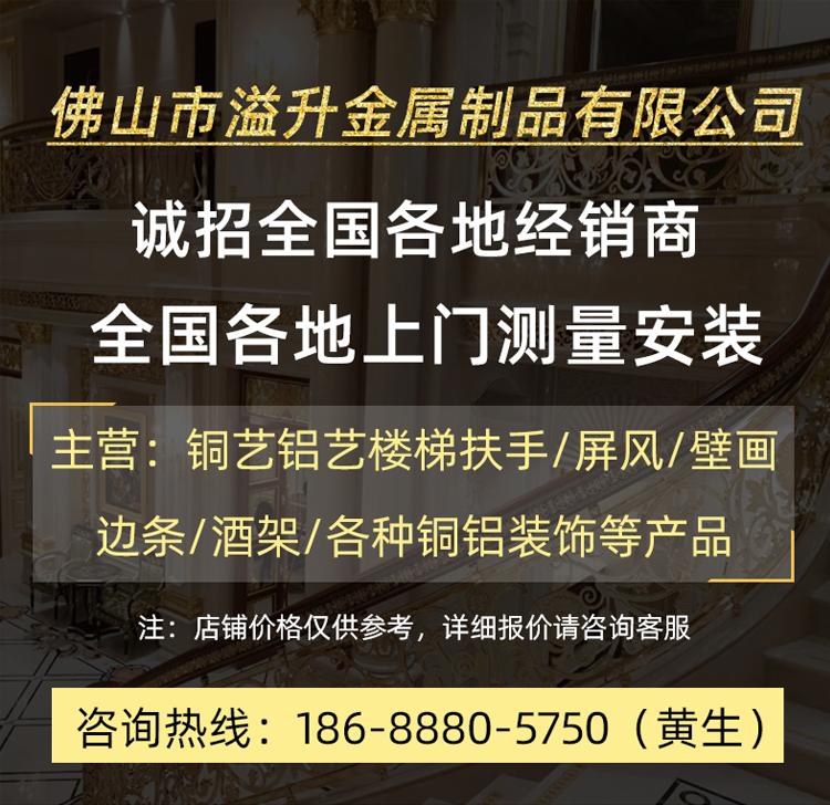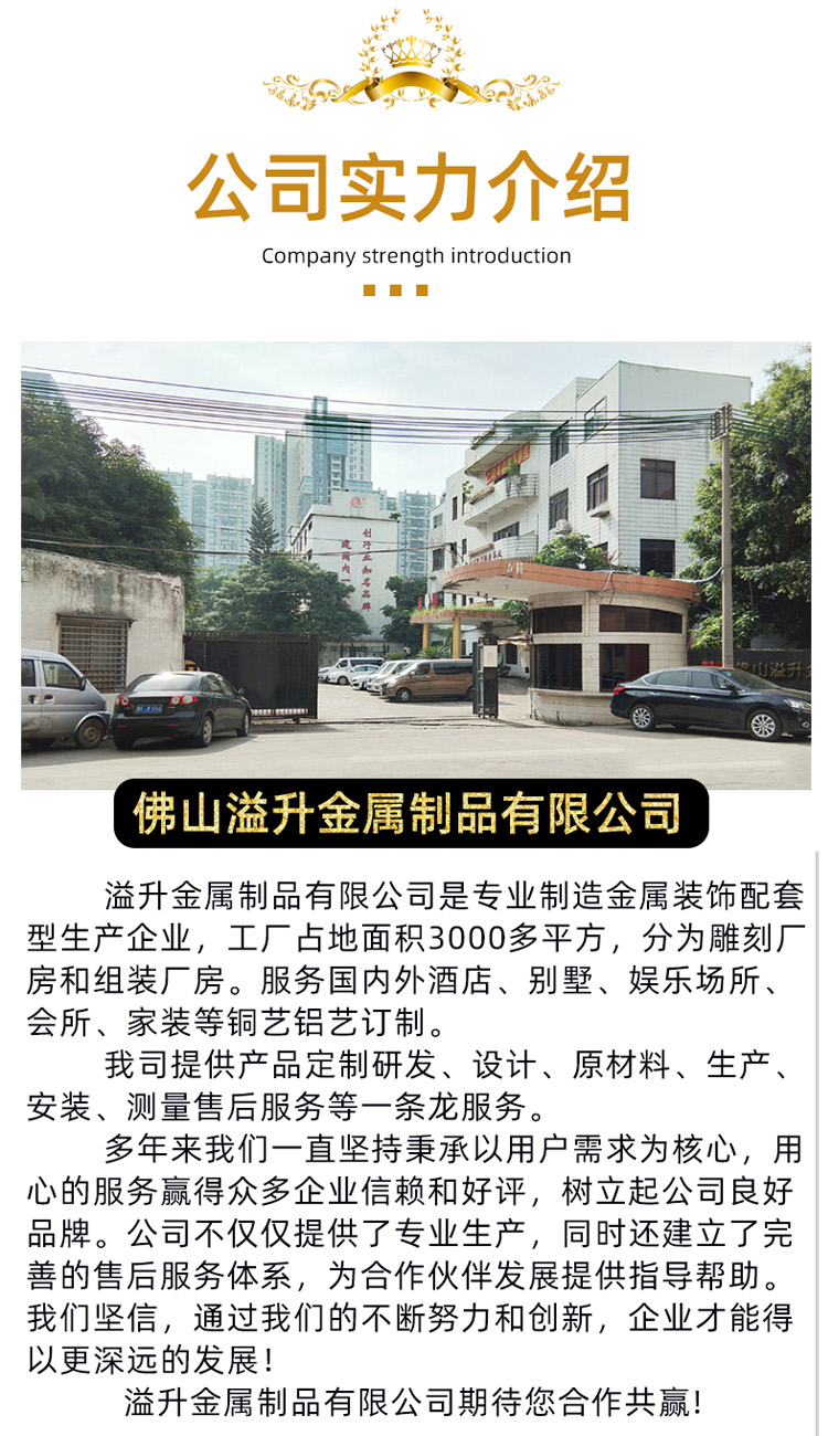 佛山溢升金属制品有限公司铝雕刻屏风生产、加工、销售,研发高端非标工艺品的现代化企业。公司利用地区丰富的资源优势,投资引进国内外最先进的技术设备,以技术创新为先导,采用先进加工工艺,研发出高端系列屏风、幕墙、护栏、门花、浮雕工艺品、新型铝合金产品以质量轻、硬度高、抗氧化、色彩变化多样完美展现出目前五金装饰品的优势。