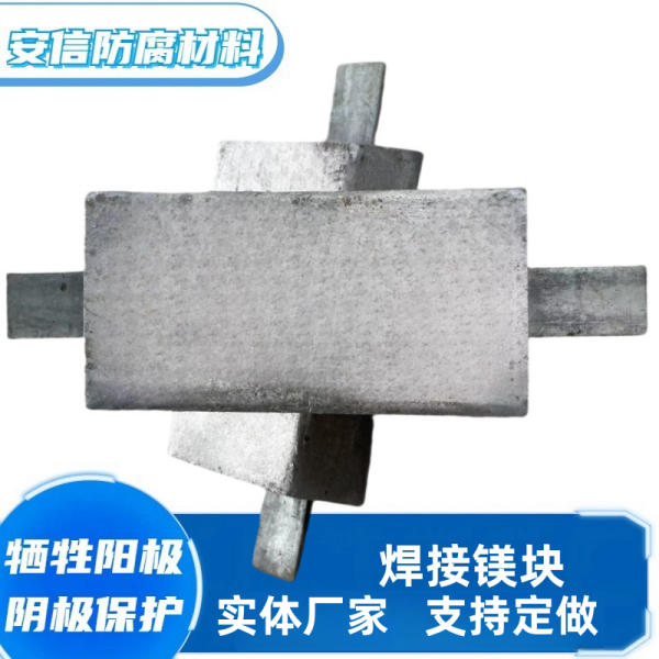 镁阳极有高驱动电压、低电流效率、造价高。根据形状以及电极电位(开路电位)的不同,镁阳极可用于电阻率在15欧姆·米到150欧姆·米的土壤或淡水环境。一般不应用于土壤电阻率小于10欧姆·米环境。高电位镁阳极的电位为-1.75V CSE,驱动电压0.85V;低电位镁阳极的电位为-1.55V CSE,驱动电压0.7V。使用温度可以达到100℃。当牺牲阳极剩余量为最初重量的15%,即认为阳极失效,所以,阳极的使用率一般取85%。