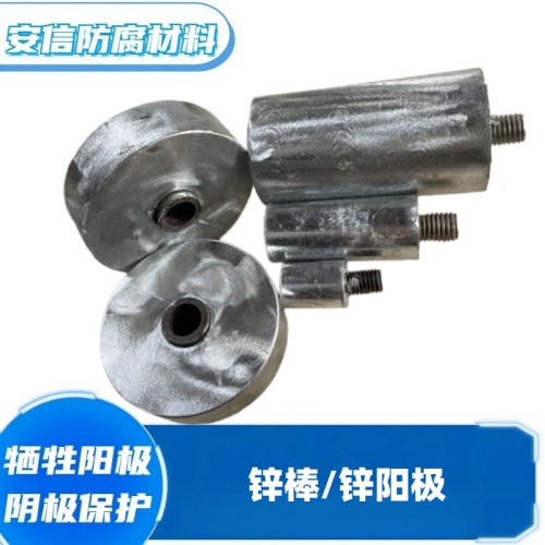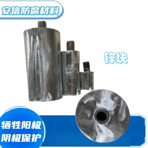 锌也可做成镯式阳极,主要应用在水下和海底管道上,一种是作成块状然后焊接在钢支架上形成一个圆形,还有直接做成半环状,直接扣在管道上。