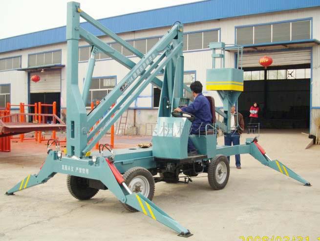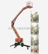 曲臂式升降平台,移动方便,折臂结构紧凑,采用新型优质型钢,强度高,重量轻,直接接入交流电或采用本身直流电源启动,架设速度快,工作台既可升高又可水平延伸,还可旋转,易于跨越障碍物到达工作位置,是理想的登高作业设备。