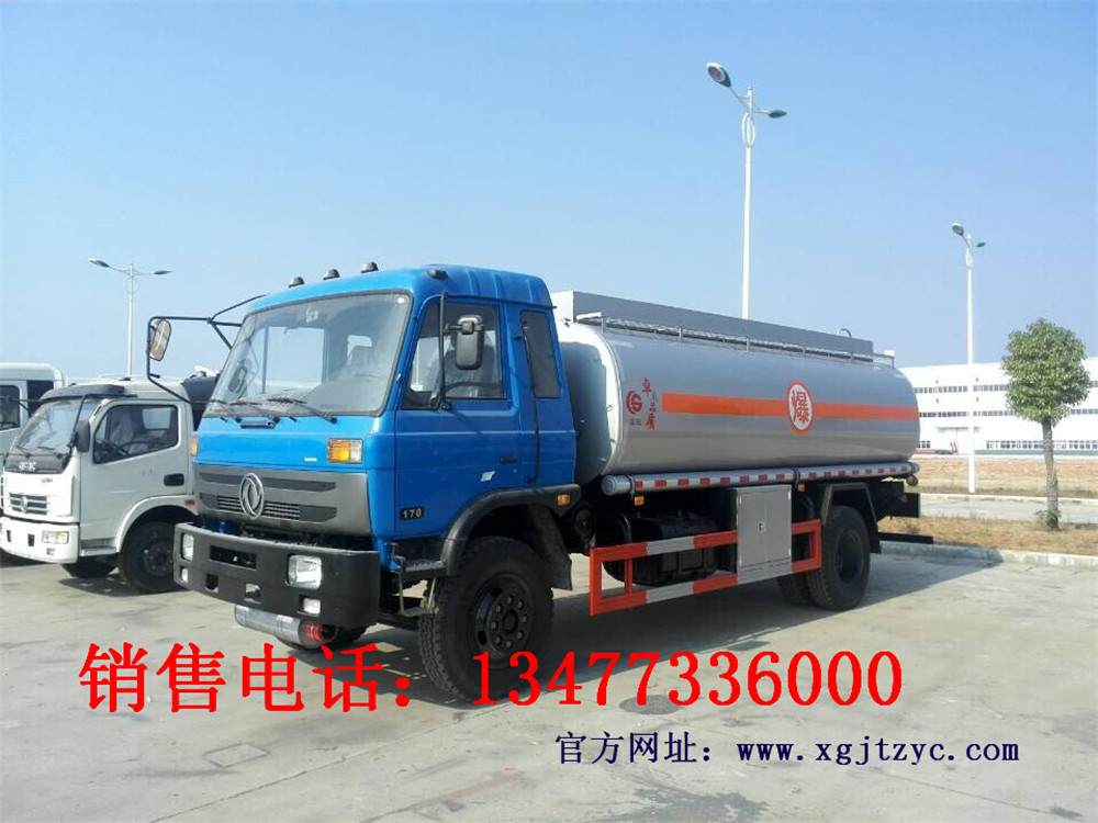 东风天锦10-13吨加油车、运油车。发动机:东风康明斯(国四)发动机180马力,功率:132kw。总质量:16000kg 额定载质量:9800kg 整备质量:6005kw 轴距:4700mm 轮胎:10.00-20 10.00R20,9.00-20 9.00R20 ,ABS防抱死,加油机可选,外形尺寸:9000×2490×3050mm。罐体有效容积:14.7立方米,类项号:3,运输介质:汽油,密度:700千克/立方米,罐体外形尺寸:6100×2250×1500mm。