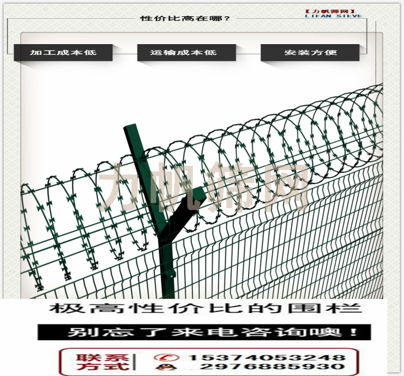 刀片刺网、刺绳采用优质Q235低碳钢丝(经热镀锌,电镀锌,涂塑,喷塑)防腐处理拧编而成,产品具有牢固,美观的特点,可以广泛用于草场边界,铁路,高速公路的隔离防护场所使用。我公司可以针对一些客商定制的特殊规格、型号的刺网产品,无论是量大还是量小,我公司都能迅速组织生产,生产经营多种规格、型号的冷镀锌刺绳、热镀锌刺绳、涂塑P...