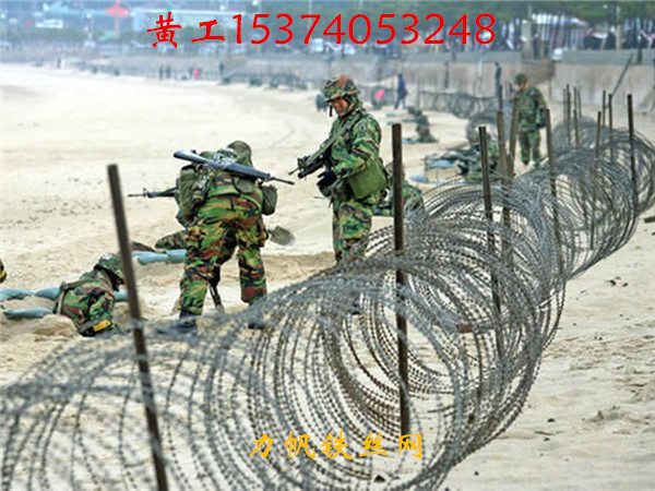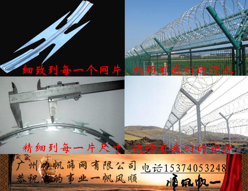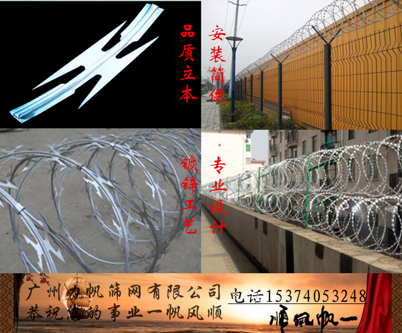 刀片刺网由热镀锌钢板或不锈钢薄板冲压出尖锐的刀片状,高张力镀锌钢丝或不锈钢丝做芯线组合而成的阻绝器材。由于刺网造形独特不易触摸,因而能达到极好的防护隔离效果。产品的主要材质有镀锌板和不锈钢板。刀片刺绳按照安装方法不同可分为:(蛇腹式)