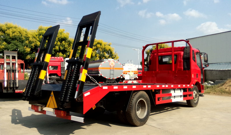 平板运输车也叫平板拖车、平板车、推土机运输车、挖土机运输车、钩机运输车、挖机平板车、挖机平板运输车、挖机平板拖车、挖掘机拖车、挖掘机板车、钩机平板车、钩机平板拖车等;后面带爬梯,主要用于运输一些像挖掘机,装载机,收割机一样的不可拆卸物体;平板运输车广泛用于工厂,工地等大型生产或工程所在地,平板运输车的承重能力强的特点使其在经济发展过程中起了重要作用。