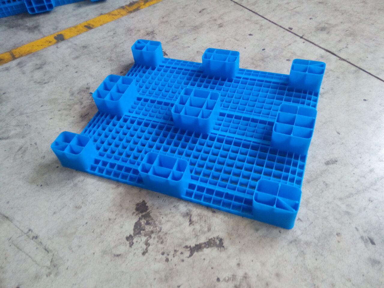 即根据塑料托盘的外形而言的,此类型的塑料托盘底部为九脚型,因而得名九脚塑料托盘。此类一般承载都比较轻,不适合于上货架或者转载大重量的货物,九脚托盘一般都作为仓库轻型货物垫仓板,叉车周转较轻货物使用。此类托盘表面形状有:平面与网格之分。