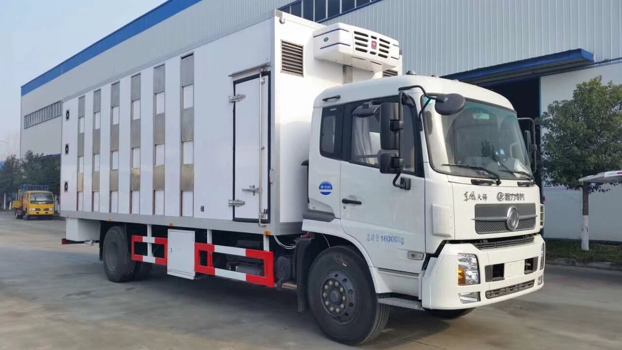 畜禽运输车,箱体为全不锈钢保温结构,外部部分玻璃钢饰板;1,分层装载机构:箱体内分层装载机构,通过液压系统,实现隔板的升降,每层隔板配置分栏隔断。