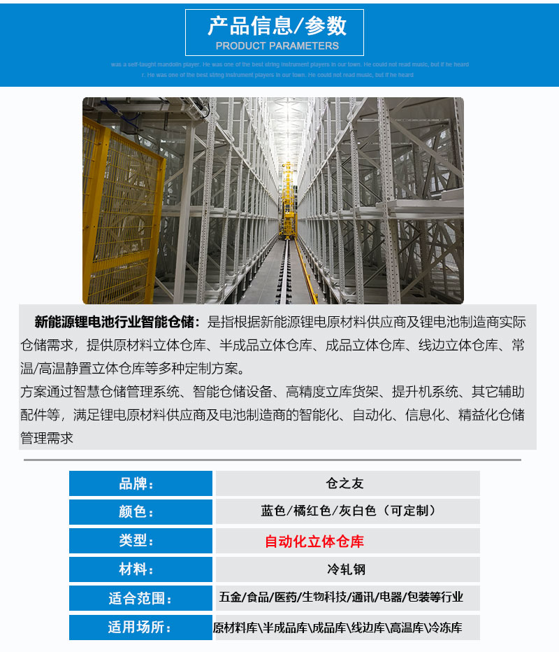 新能源自动化仓库 新能源智能立体库 无人化仓库自动立库找中山仓之友仓储设备有限公司,自2018年开始到现在,我司连续承接新能源自动化立体仓库货架项目。逐渐形成了完整的新能源配套货架产品的构件设计、模具成型、产品成熟 。