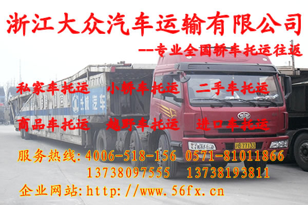 轿车托运,杭州轿车托运,私家车托运,小轿车托运是由浙江大众汽车托运有限公司投资600万元组建的浙江专业轿车托运企业。始建于二零零六年,杭州轿车托运公司提供:轿车托运,托运轿车,私家车托运,小轿车托运,越野车托运,面包车托运,跑车托运等杭州轿车托运服务,杭州车托运公司先后被上级政府部门赋予杭州轿车托运行业文明单位、托运轿车运输行业达标单位和《五星级》企业,市外劳力管理先进单位、市外事办指定的外事任务运输服务的唯一企业。