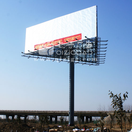 单立柱一般为钢架结构。钢管和角铁制作而成。现在也有少数网架结构的。在一根立柱上面安装一个长方型的或三角型的牌面。在牌面封上镀锌铁皮或彩钢板。通常面板数量为两面、三面。现在还有少数的四面单立柱。通常牌面尺寸为:14*5m、18*6m、21*7m。。多与喷绘画面相结合,也可制作成三面翻和电子显示屏,再加上图案或文字达到广告的效果。通常立柱总体高度为15m、18m、21m。受众面多为来往的车流量和人流量。