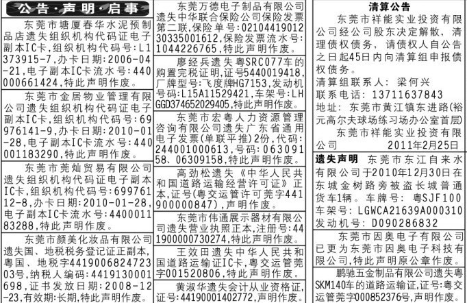 东莞日报遗失声明公告启事;羊城晚报遗失声明公告等,遗失声明包括(银行开户许可证、营业执照、税务登记证、增值税发票遗失、组织机构代码证、车辆遗失、普通发票遗失、统一发票遗失、支票遗失、收据遗失、身份证遗失、就业证遗失、报关证遗失、从业资格证遗失、工作证遗失、毕业证遗失、会计证遗失、驾驶证遗失、行驶证遗失、台胞证遗失等);清算公告;注销声明;政府公告;合并公告;房产公告;减资公告;招标公告;寻人启事;更正声明;拍卖公告;法院公告