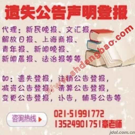 先登报,再带报上门收费.www.shdengbao.com 广告投放热线:13501684387本公司代理《新民晚报》《解放日报》《新闻晨报》《文汇报》《青年报》《新闻晚报》《上海商报》《劳动报》遗失声明、登报挂失、遗失登报、登报声明、声明公告、讣告、公司注销、注销登报办理、注销公告、减资公告、歇业公告、律师声明、清算公告、变更公告、股权转让、上市公告、敬告通告、寻人寻物启事…….