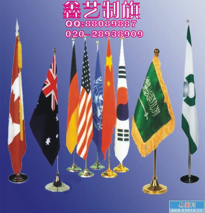 广州鑫艺旗帜主要业务范围有:四色热转印彩旗、天河司旗、番禺厂旗,班旗,标志LOGO旗,桌旗、串旗,挂旗,会议旗,党旗、国旗、外国旗、四色条幅、普通条幅,表彰锦旗,礼仪带绶带,袖章,品种全、价格优惠,质量保证,交货快,各国国旗,各国国旗彩旗,世界各国国旗,制作定做色牢度强、着色准确、抗风性强、飘逸感好,能完成较复杂的彩色图案,能做出由深变浅的过渡颜色,色牢度强、颜色表现丰富、可印复杂图案.具有抗腐蚀、抗老化、耐高温、防火、防水、能保持数年不变色的特点.