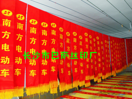 长沙市巴萨丝印厂专业制作横幅 绶带 桌旗 司旗 旗帜 彩旗等加工制作定做专业工厂,工厂自2001已成立以来,经过艰辛的10年专业生产研究。现已经是湖南老品牌专业工厂了。一直以来都得到广大客户的高度好评。现已经是湖南同行效有影响力的专业丝印 染印 直喷 移印等流水线生产加工制作厂家,技术领先价格从优。本公司还承接各种庆典活动,并大量供应出租充气拱门 充气气球等业务,公司里有专业的人员,专业的队伍和一流的服务让客户无后顾之忧。公司本着服务于客户的宗旨,秉持“以诚为本,以信取人”的经营准则,努力为客户提供最高品质的产品和服务,不断开拓创新,把握住属于您的每一次契机,与您共同成长!公司的经营理念:诚实做人 踏实做事,今天的质量 明天的市场。今年公司投入巨资购买的全新进口设备,现在日产量已有了很大的提升。公司承诺现优惠广大新老客户 欢迎广大客户前来咨询 电话 15111157151 0731-89792340 qq:269419226 87283375
