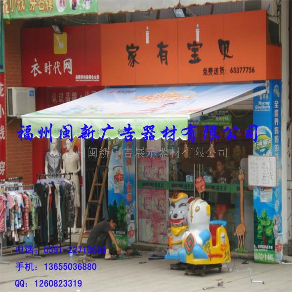福州闽新展示器材有限公司专业承接各大店面雨遮,店面遮阳蓬,伸缩遮阳蓬,伸缩遮雨蓬订做,还有家庭式遮阳蓬,遮雨蓬订做,休闲遮阳蓬,休闲遮雨蓬订做,可以喷绘广告,也可按客户要求的图案订做,福州市区内可以上门安装,是目前福州最专业的雨遮阳遮生产商,欢迎广大用户来电咨询。