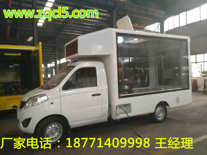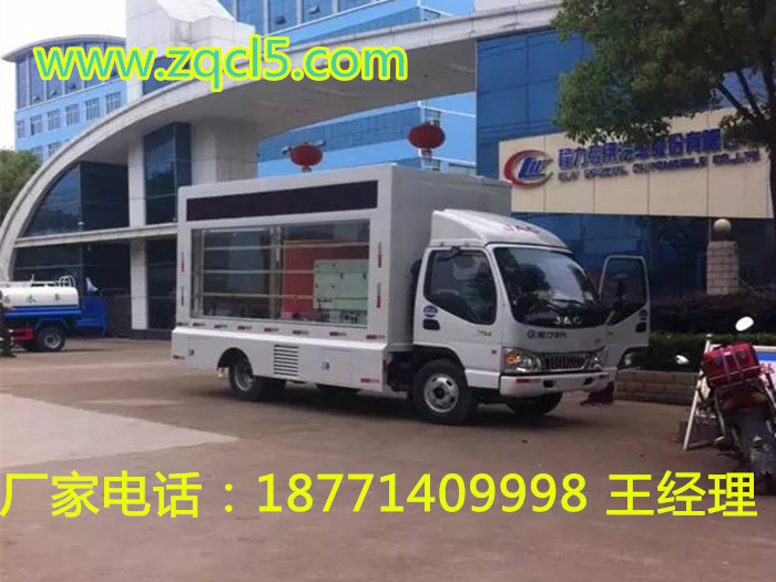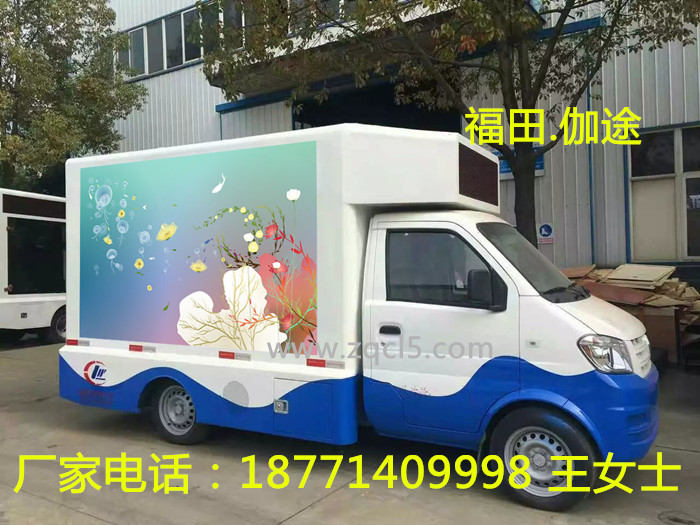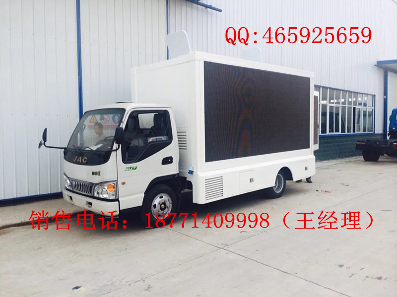 LED广告宣传车,驾驶室左右两侧厢体安装P8户外全彩LED屏,整车框架结构,车厢整体采用钢骨架冲压成型,厢体结构材料为防腐冷扎钢板、厢体表面光滑平整车厢整体为圆弧包边,底板与裙板坡边处理;顶部平坦,尾部有转向灯、刹车灯、尾灯,警示灯;造型美观大气。