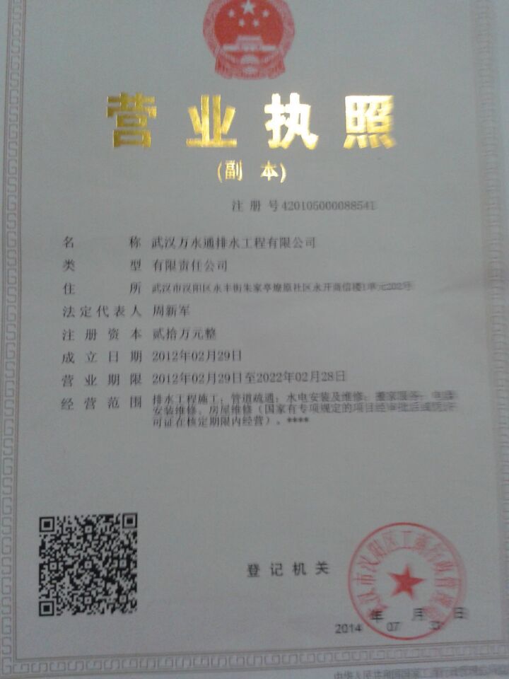 武汉万水通排水工程有限公司主要经营:疏通水池、马桶厕所;清洗各种污水雨水管道、市政管道;清理化粪池、隔油池和抽粪。