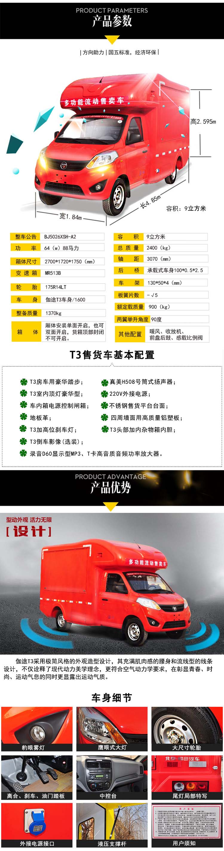 流动售货车三侧窗可灵活伸展,驾驶室顶导购罩为大空间储物箱充分拓展售货空间。前盘后毂刹车系统,自动供电,外接高音喇叭,220V外接电源接口,货厢三面均可展开,颜色多种可选。售货车出厂安装有市电外接接口,在条件允许的情况下可直接接通市电。也可以在车内加装蓄电池,再根据所需电压安装逆变器,将电池电压转换到所需电压直接使用,环保又安静。还可以直接携带小型汽油发电机,发电以供设备使用。
