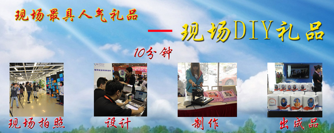 本公司推出现场DIY服务。现场拍照。把客户照片现场印在杯子,衣服,包包等礼品上。来宾开完会后离场把这带有他们自己照片的礼品发放给他们。杯子,水晶等产品上都有他们自己的照片。具体可以看看我们实际的产图。