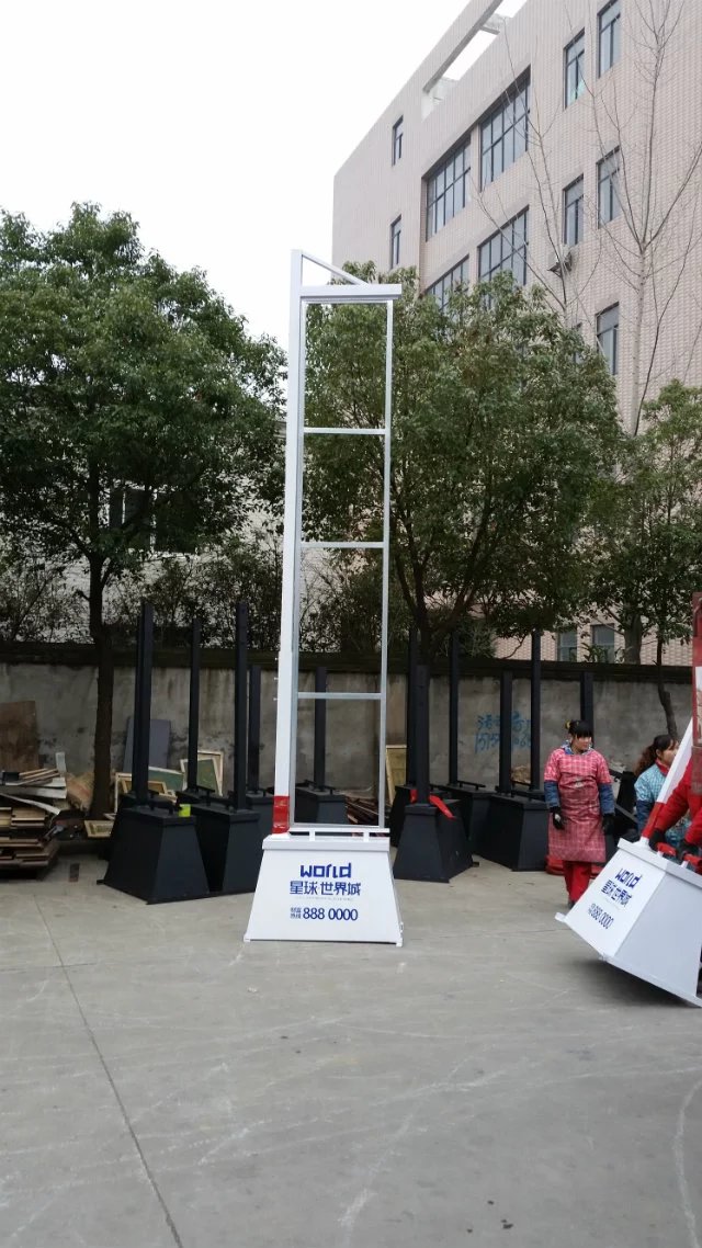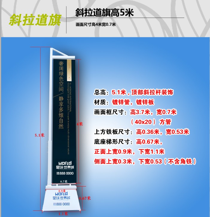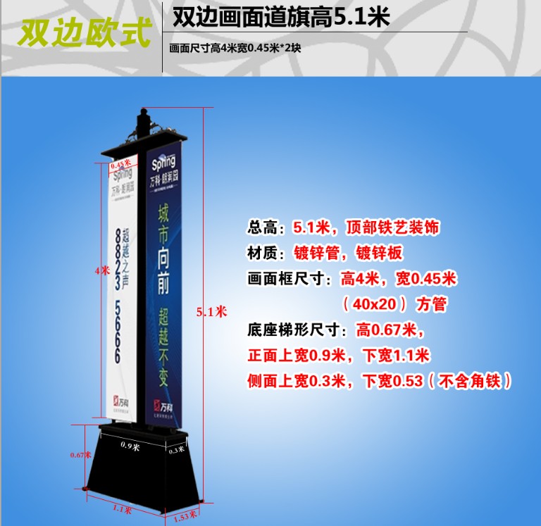 欧式道旗整体高度5.1米(可定制3.4.5.6米的),画面宽0.7米,高4米,底座用1.5mm镀锌铁板,旗杆是2.0mm厚截面40mm的镀锌方管。