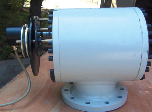 内置式插入收绳传感器安装在液压缸支撑2球面轴承与端部法兰之间,通过钢丝绳与活塞杆相连接,当液压启闭机的活塞杆处于上限时,钢丝绳缠绕在收绳器的线轮上,外伸时钢丝绳随着活塞杆的移动被拉出,带动线轮旋转。同时与线轮同轴安装的卷簧被卷紧在钢带轮上始终处于蓄力的状态。当活塞杆回缩时依靠弹簧的蓄力带动线轮旋转,使钢丝绳始终以张进状态被回收卷绕在在线轮上。由于线轮一端通过联轴器与编码器相连接,同步旋转。从而完成从活塞杆伸缩直线位移量到编码器旋转产生的信号转换过程,通过专用电缆将信号传至智能仪表或PLC控制系统,实现闸门自动控制.并输出上下极限开关量信号,供控制系统使用。极限位置全量程可调