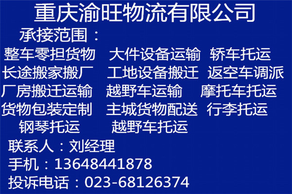 重庆渝旺物流公司承接:长途搬家;包车托运;家电家具托运;轿车托运;整车零担;贵重物品托运。专业长途搬家公司 货运专线 专业运输 家具沙发,展柜 钢琴 冰箱 空调 洗衣机 汽车配件 电子电器 重工机械 大件设备等提供专业运输!