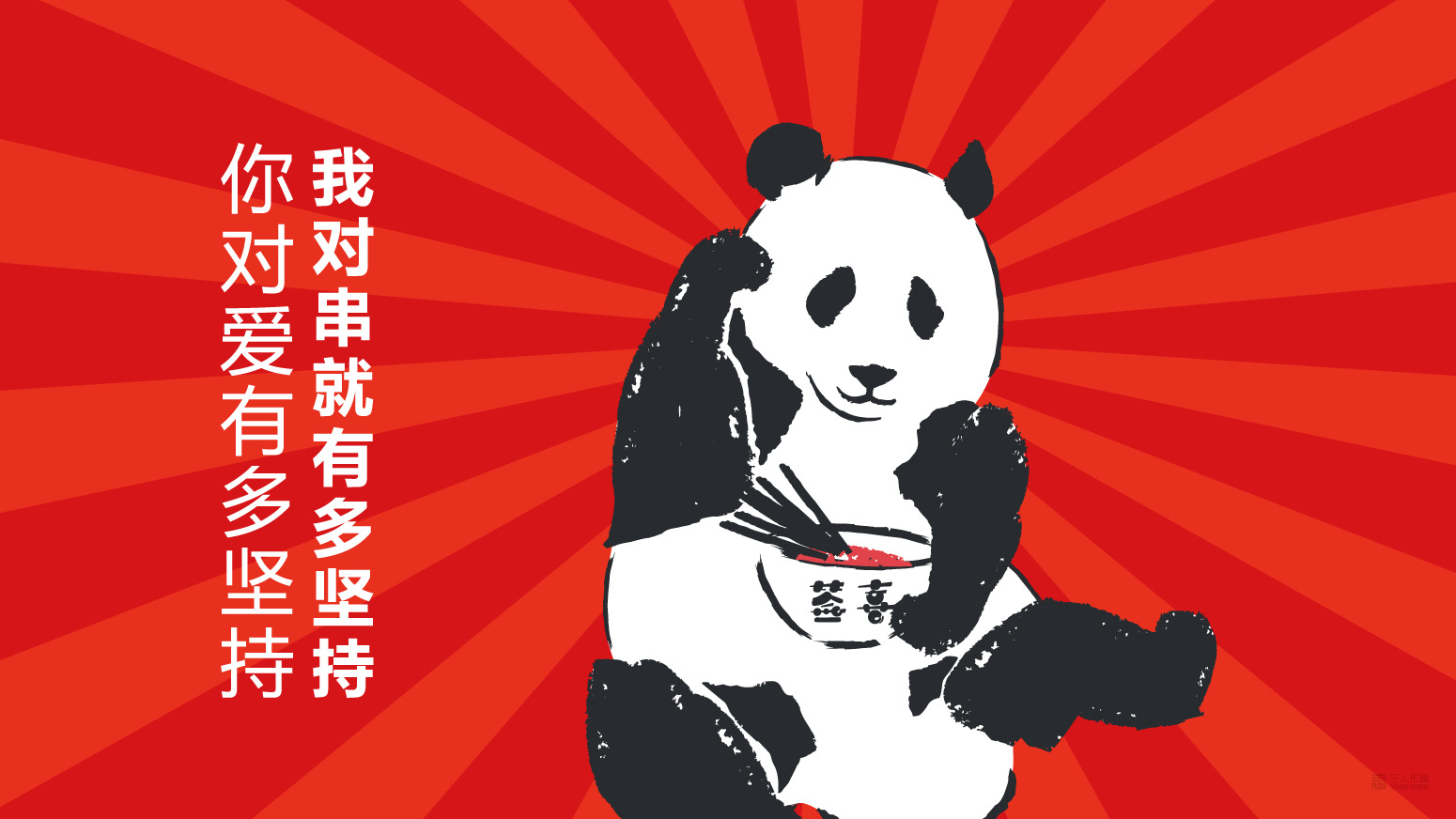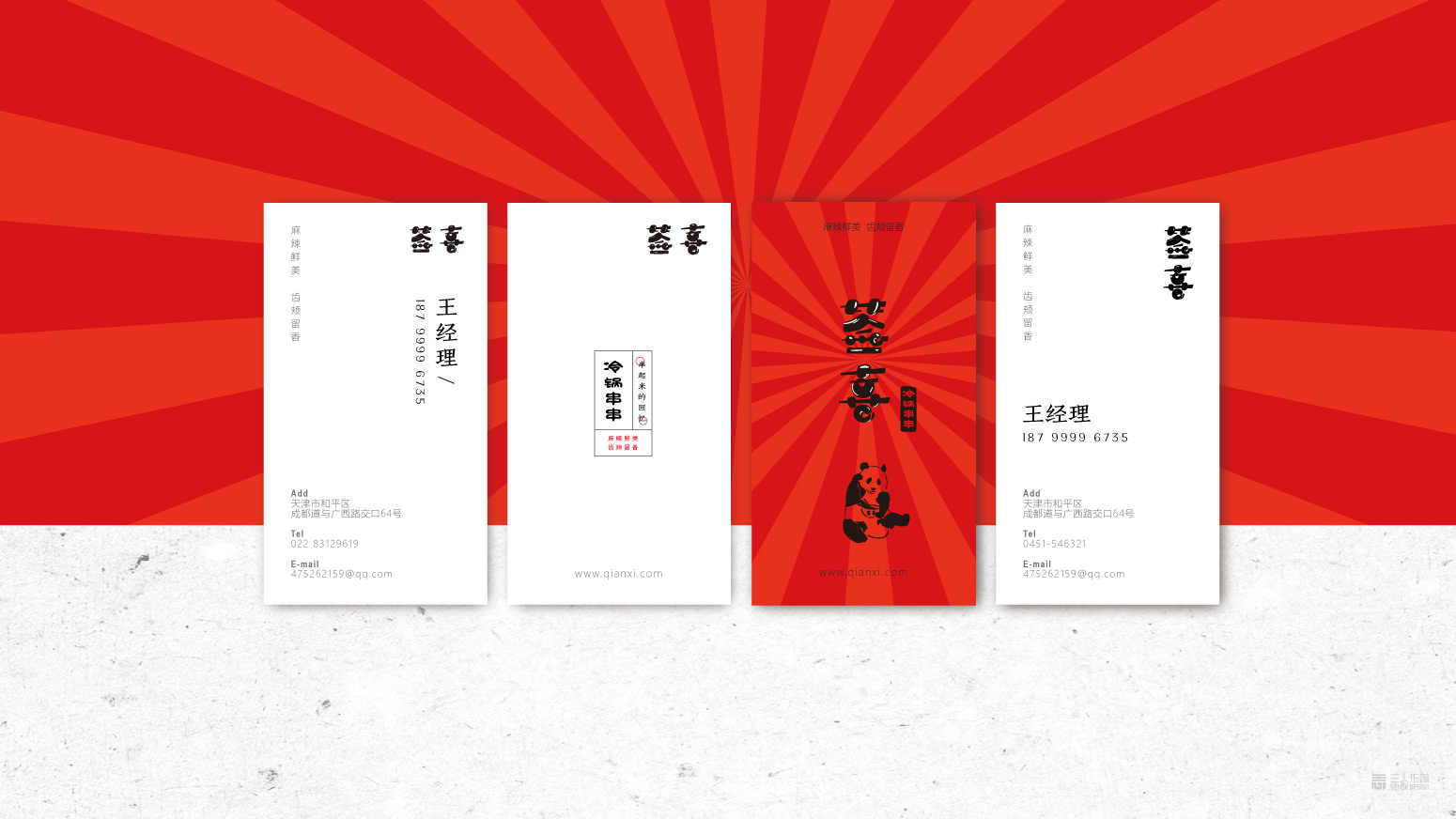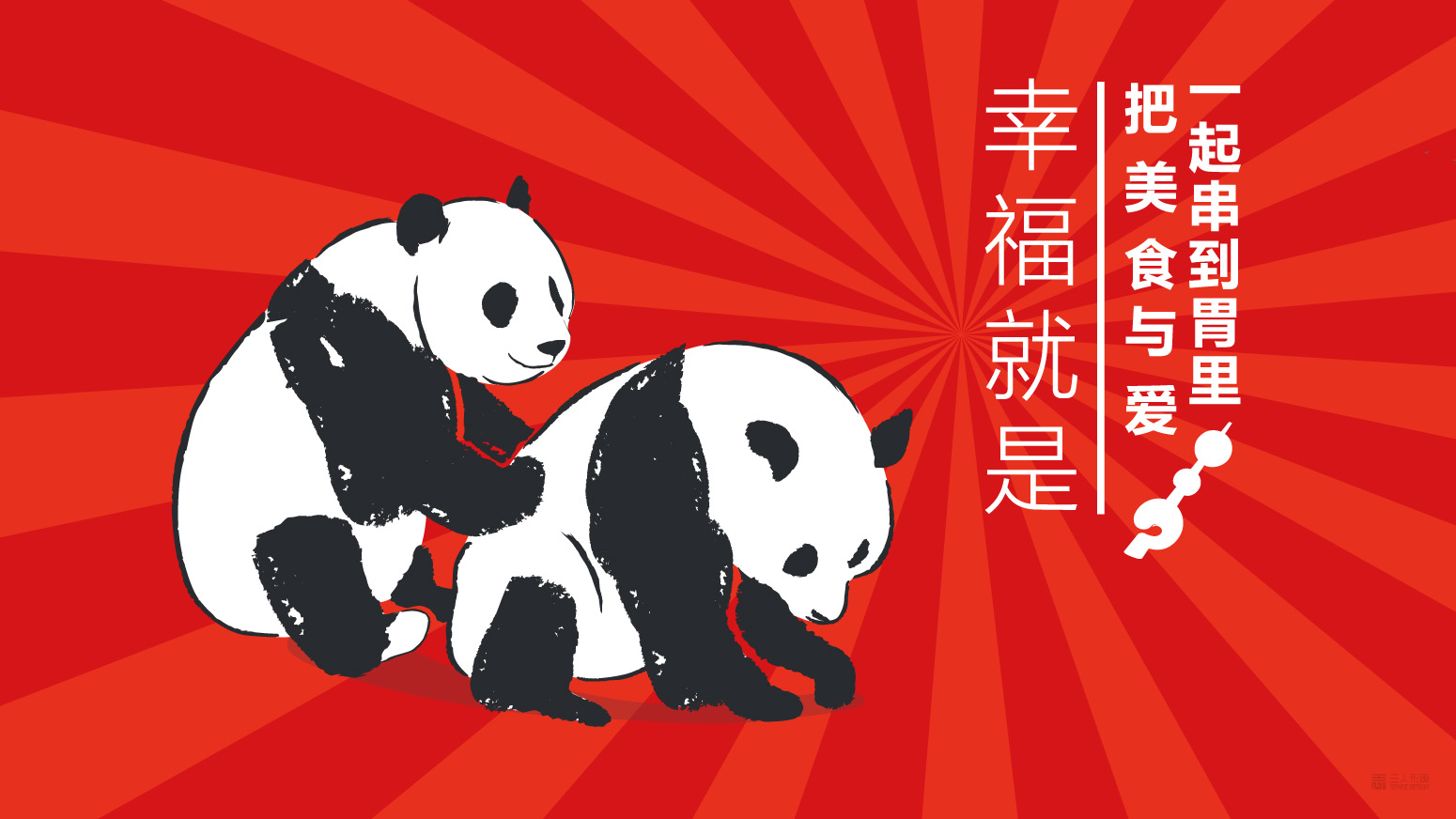 对于签喜的超级形象的设计,延续了logo的主要风格特色,同时采用火热的红色与圣洁的白色为主要色调,红色代表着火辣热情的成都美食特色,白色则给人一种安静宁静的用餐感受,两种色调的冲击,让消费者在舒适的环境中品尝着特色的成都美食,同时在超级形象的设计中,添加了“熊猫”的元素,“熊猫”是我国的“国宝”,也代表着成都的地域特色,憨态可掬的熊猫抱着签喜的冷锅串串,增添许多的亲切感。