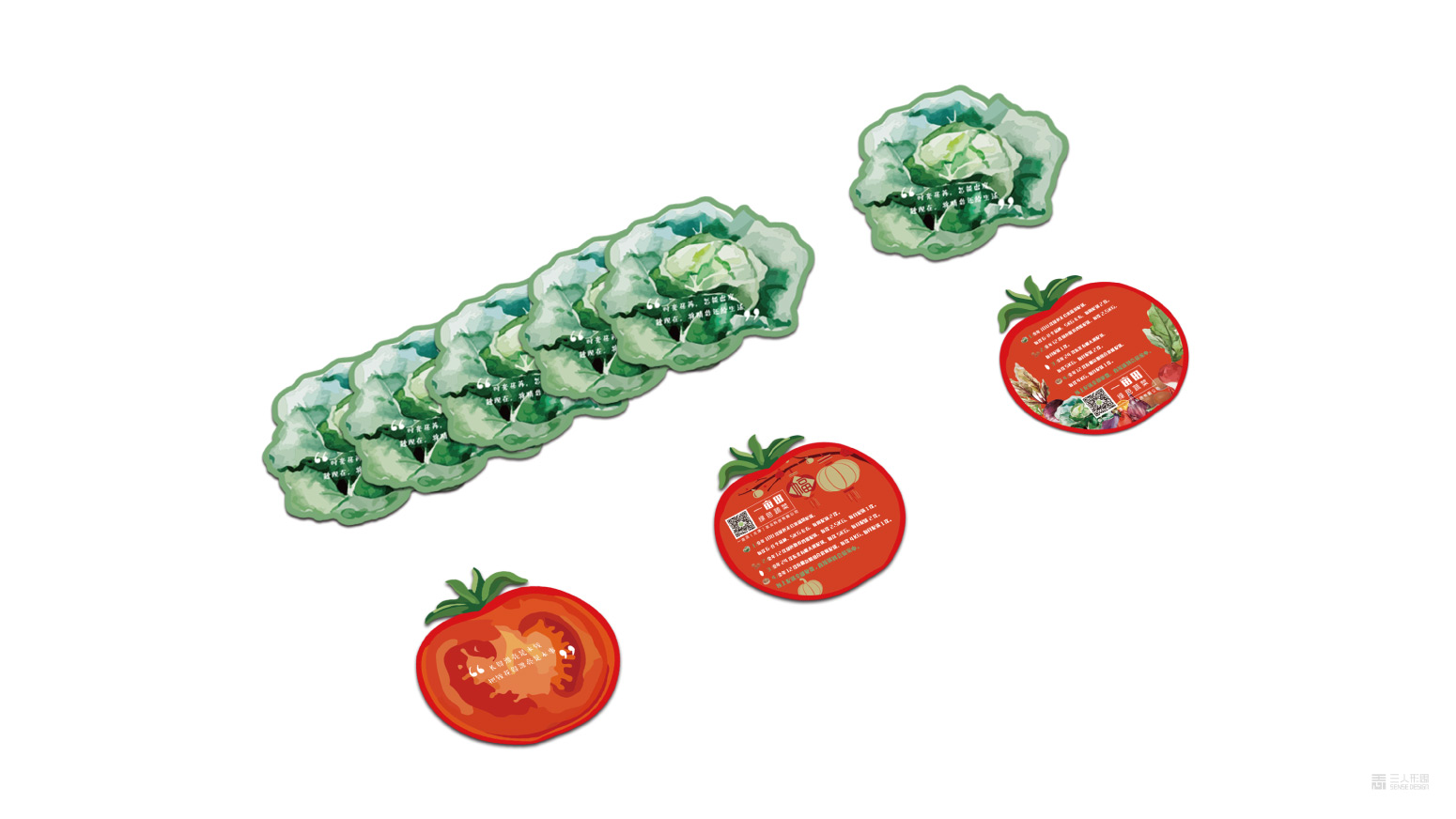 标签设计为各种蔬菜的形状,正面为蔬菜的手绘造型,画面细腻、形象逼真,吸引消费者的注意力。背面为产品信息,以婷婷袅袅的女郎形象为配图,传达健康绿色蔬菜,吃出好身材的理念。不同款式的标签配有不同的文案,个性有趣,使消费者印象深刻。这样的设计符合电商方便快捷、轻松愉悦的调性。