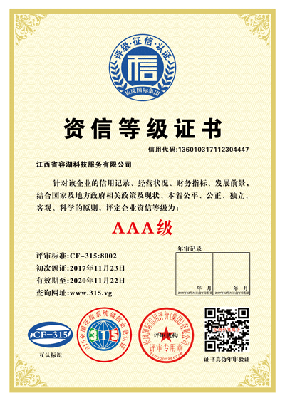 江西省企业信用评价资信等级AAA评估企业信用评级证书