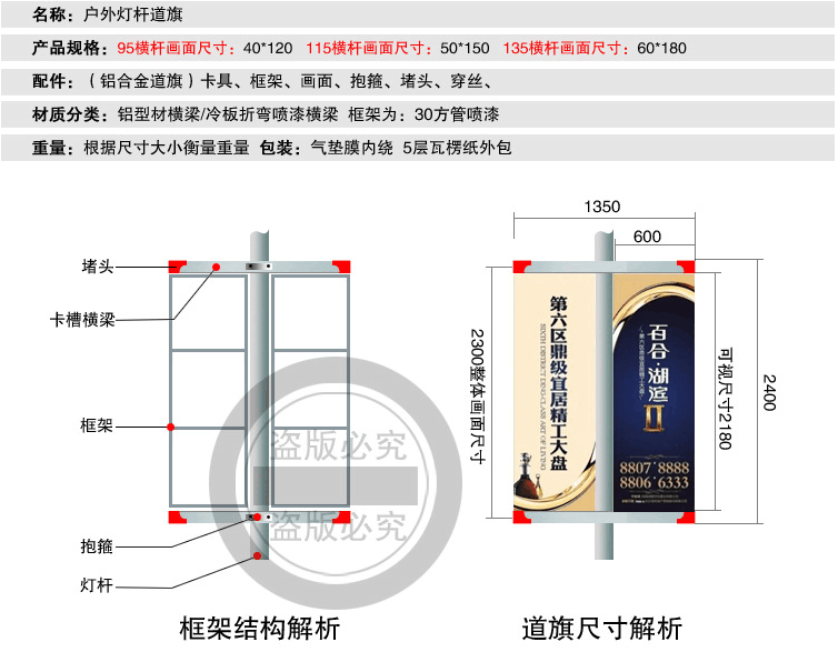 道旗的旗杆(支撑杆):目前的道旗安装旗杆支撑有普通铁质方管和圆管,也有不锈钢管和镀锌管,上下横梁采用铝合金型材,与一般的铁质方管、
