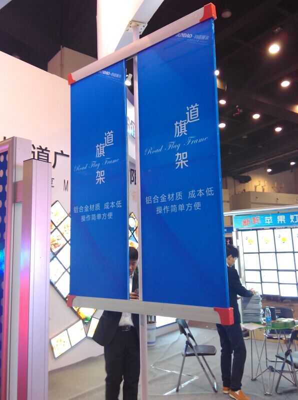 材质和做工上精简了许多。所以道旗支架能达到良好的紧固性和抗风力与抗拉力就行了。道旗支架没有严格的要求。但却是很关键的部位所以选材一定