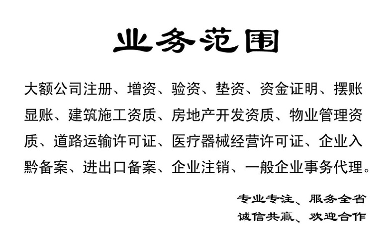 专业代办贵州省建筑业企业资质新办、升级、增项、年检;安全生产许可证代办,房地产开发资质代办、装修装饰资质代办,公司注册代办;医疗器械经营许可证,道路运输经营许可证,食品流通经营许可证,酒业经营许可证,进出口权申请,工程个人企业亮资、增资、验资、垫资,个人摆帐、显帐,代理记账,进出口备案,企业注销,提供岗位人员评审、八大员评审、技工评审各类人员挂靠!不成功不收费!资质代办、公司注册代办等服务