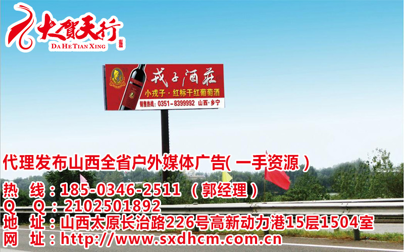 【山西大贺天行文化传媒有限公司】简称山西高速公路广告公司,全国招商热线:185-0346-2511,是山西省太原市具有实力的市区户外大牌和山西认定高速公路户外媒体资源(一手资源)供应商,提供山西省内各大高速公路跨线桥、擎天柱广告:山西全省高速广告牌、山西高速擎天柱、山西高速跨线桥、太原市区大牌、太原环城收费站、太原火车站灯箱广告等专业策划、发布山西高速公路广告,公司自有高速公路户外广告媒体拥有数量可占山西全省80%以上的市场份额,多年运营高速广告并与政府公路管理部门有着良好的合作关系。