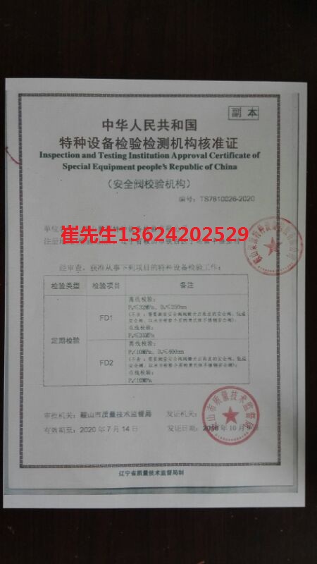 黑龙江哈尔滨安全阀在线校验离线检验检测安全阀维修修理——咨询:13624202529鞍山聚源安全阀校验检测有限公司是辽宁鞍山地区安全阀校验的第三方公司,承接各类型的安全阀在线、安全阀离线校验、安全阀维修项目,按用户要求,根据具体实际情况和不同介质制订校验和维修检验方案。为企业的设备安全运行保驾护航。(辽宁海城本溪丹东大连辽阳鞍山安全阀离线在线校验检验检测沈阳营口大石桥阜新朝阳葫芦岛盘锦锦州安全阀维修修理。热线13624202529