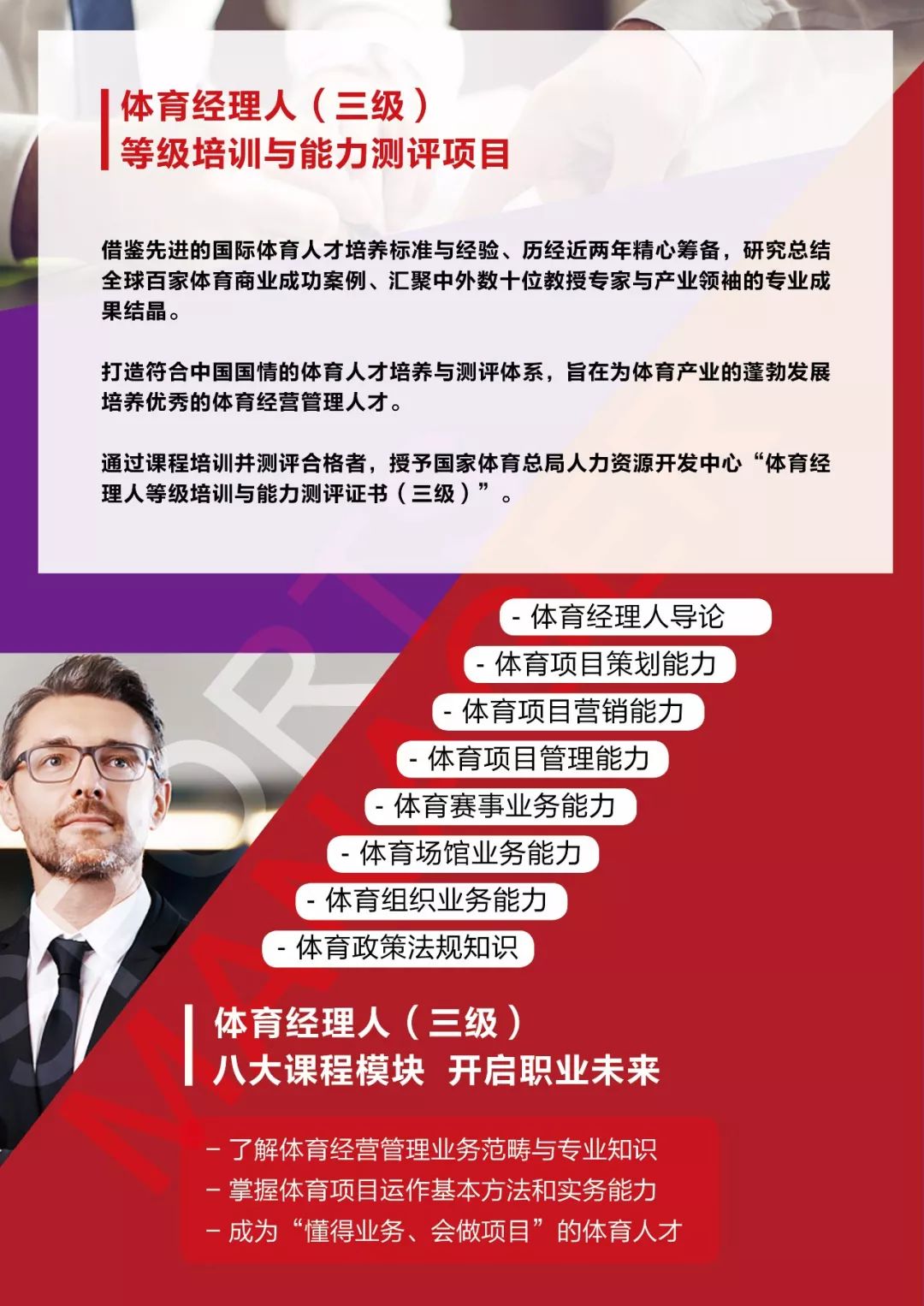 由国家体育总局人力资源中心颁发『体育行业权威人才证书』8月29/30日,9月5/6/11/12/13日期间在线上培训及测评。该项目为“新时期体育人才培养改革创新项目”培养优秀的体育经营管理人才、总局指定教授专家为您授课培训,高效率地了解体育经营管理业务范畴与专业知识掌握体育项目运作基本方法和实务能力,成为“懂得业务、会做项目”的体育人才。测评合格者,将获得总局颁发的“体育经理人证书”,该证书也是地方政府体育项目的加持证书,用于项目招标、项目评选、项目扶持、从业求职等加分项,将成为体育产业未来发展趋势!