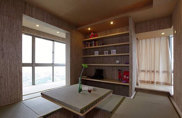 小编点评:由于整个房间被挑高了,因此客厅的空间相对的就会低矮一点,但是背景墙上几扇长条形镜子的使用在无形中起到了扩大空间的作用。沙质的窗帘也为客厅保留了点点光亮。