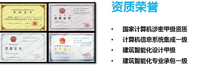 数年的市场耕耘,使公司在各个方面都得到了长足的发展,取得了社会和业界的认可。公司已通过了ISO9001:2000国际质量管理体系认证,具有工业与信息化部授予的“计算机信息系统集成壹级资质”、住房和城乡建设部授予的“建筑智能化系统集成专项工程设计甲级资质”和国家保密局授予的“涉及国家秘密的计算机信息系统集成资质”。公司是湖北省信息产业厅认可的“双软”认证企业,连续多年被评为湖北省和武汉市“守合同重信用企业”。