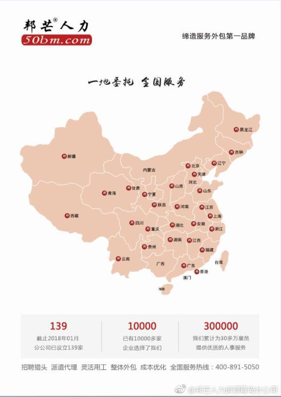 江苏邦芒服务外包有限公司昆明分公司主要业务:劳务派遣、人事代理、劳务外包、员工培训、猎头服务、人员招聘、管理咨询,如有疑问可以来电咨询!