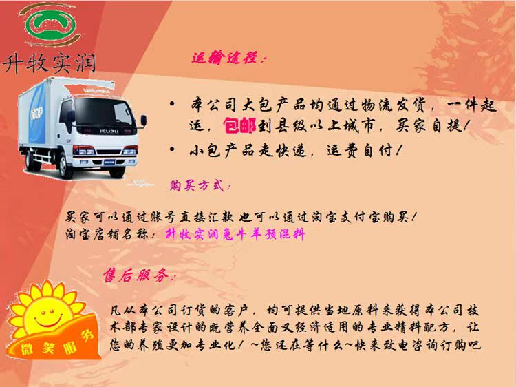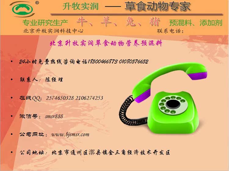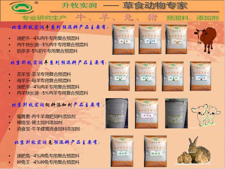 北京升牧实润-绿色饲料是一家从事销售兔、牛、羊、等草食动物复合预混料的高新技术企业,我们拥有一批在本行业有着较高威望,造诣深厚的专家及资深的专业技术人员。销售适合我国畜牧业实际发展的的草食动物高档预混料。