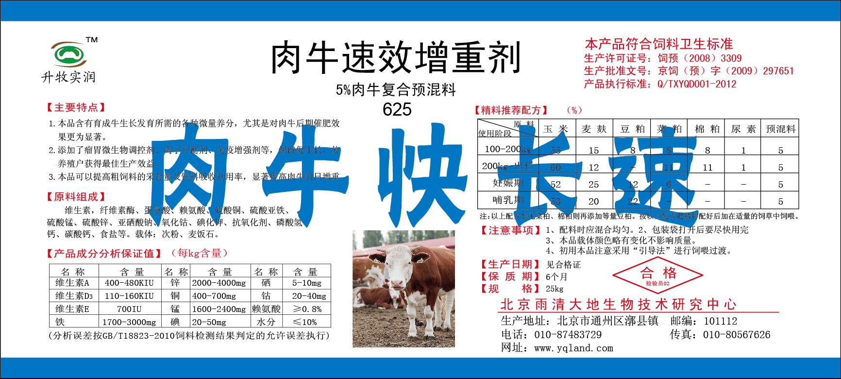肉牛快速育肥专用预混料--5%肉牛快长速,可以显著提高肉牛的育肥速度,单位体形称重大,提高养殖效益。长期使用可以提高牛肉档次,肌肉大理石纹清晰、嫩度高、失水率低。可以调节瘤胃环境,有利于瘤胃有益微生物繁殖,对提高瘤胃功能效果显著。特别是育肥前期能提高青年牛的骨骼发育速度,迅速开张骨架,使肉牛有一个硕大的育肥体形;由于有理想的体形基础,育肥后期能够迅速增重,迅速促进肌肉生长和脂肪沉淀,显著提高育肥速度,日增重可达1-2kg,淘汰牛育肥日增重可达3kg以上。