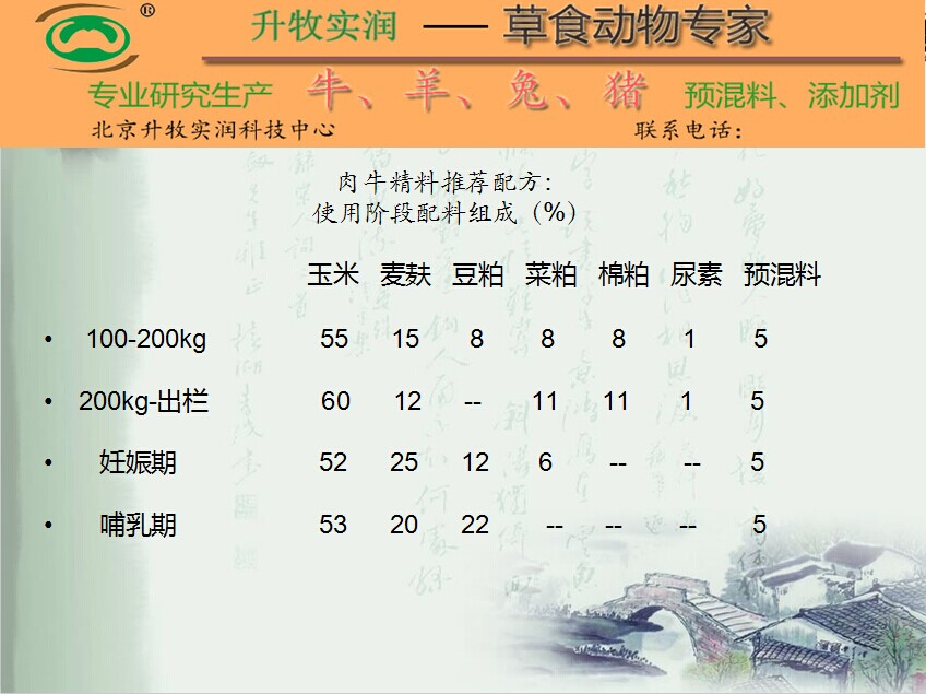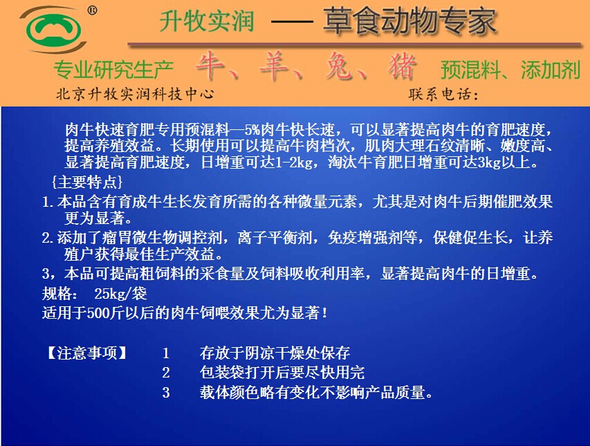 北京升牧实润牌肉牛预混料--肉牛快长速,是根据肉牛后期所需营养指标专门设计的只用于肉牛后期催肥的一种高档肉牛预混料。现在全国各地养殖户实验反馈回来的好评率高达99%。因此也增加了我们对于产品推广的自信~
