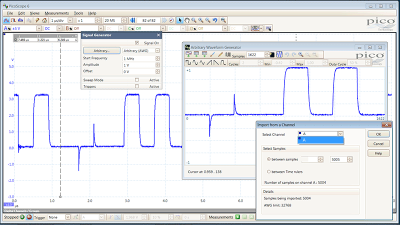 PicoScope 6407包含一个12位200 MS/s任意波形发生器 (AWG) 。用内置的AWG编辑器可创建或编辑AWG波形,从示波器示踪导入,或者从电子表格加载。