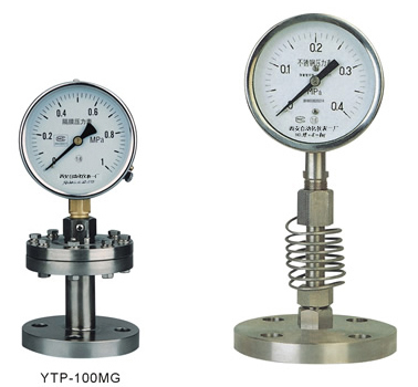 为了扩大各种通用型压力仪表的使用范围,能适用于测量强腐蚀、高温、高粘度、易结晶、易凝固和有固体浮游物介质的压力,以及对某些测量介质不能直接进入通用型仪表内和便于清洗防止沉淀物质积聚的场合的压力检测时,必须采用由隔膜隔离器与通用型压力仪表组成一个系统的隔膜表。